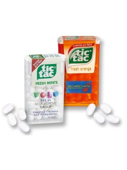 Boite tic tac publicitaire avec 2 goûts au choix (menthe ou orange) pour petits et grands ! Minimum de commande : 1200 pièces Caractéristiques clés : Format : 37 x 14 x 62 mm Conservation : Environ 6 mois si le produit est conservé dans un endroit approprié Autocollant imprimé en allemand...