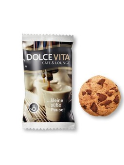 Mini cookie publicitaire aux morceaux de chocolat au lait livré dans un sachet personnalisable ! Minimum de commande : 1000 pièces. Caractéristiques clés : Dimensions : 90 x 50 mm Poids : 6,40 g Conservation : 9 mois