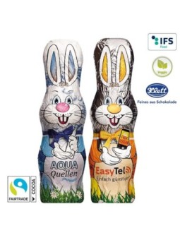 Lapin publicitaire en chocolat pour Pâques à personnaliser avec un logo ou un visuel avant toute distribution. Minimum de commande : 512 pièces