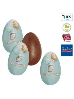 Figurine publicitaire en chocolat en forme d'oeuf, de lapin ou de poussin pour toutes vos communications autour de Pâques. Minimum de commande : 5000 pièces