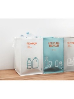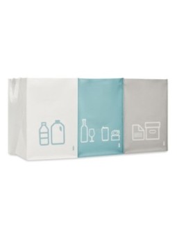 Set de 3 sacs personnalisables en RPET non tissé laminé avec poignées. Pratique pour trier papier, plastique, métal et verre. Le tarif "à partir de" est valable pour des quantités supérieures à 5000 pièces. Minimum de commande : 30 pièces