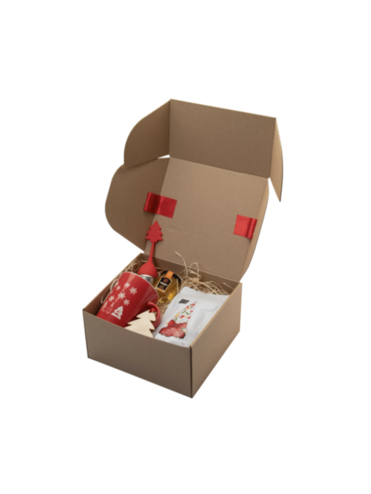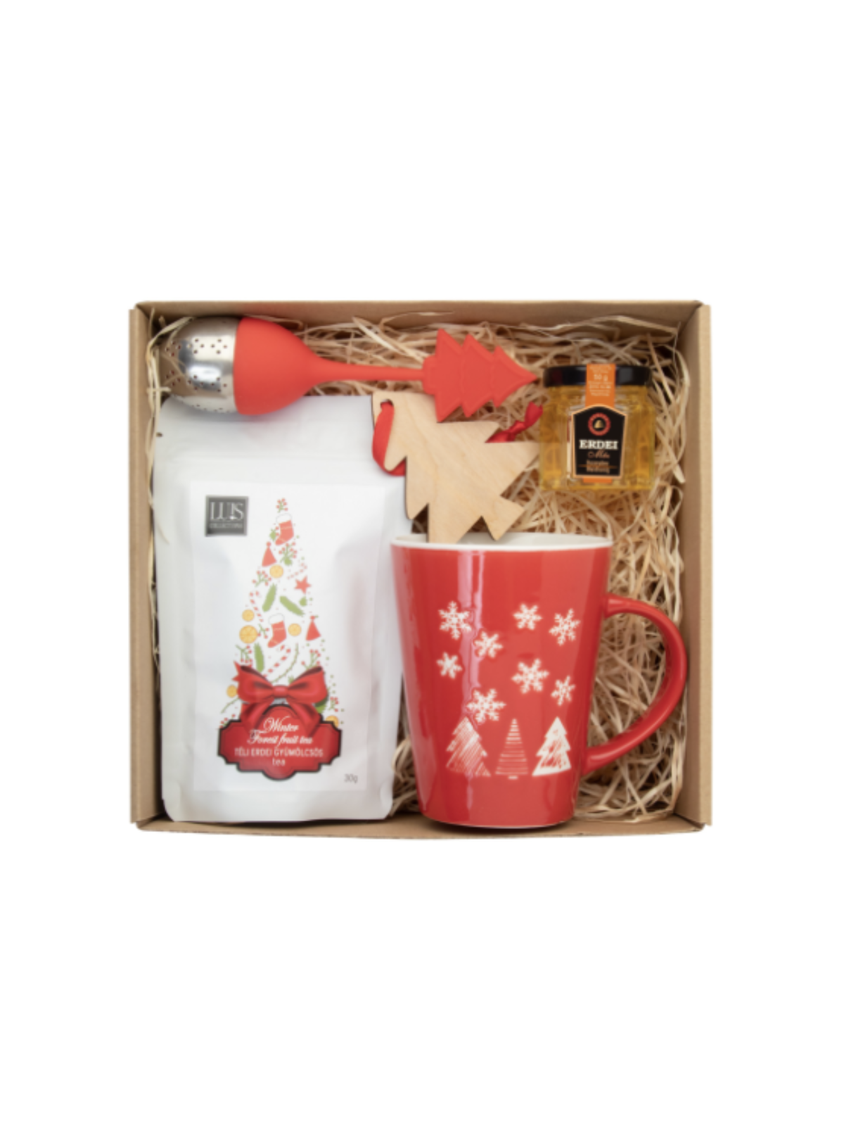 Coffret cadeau thé publicitaire personnalisable composé d'une Tasse de Noël, de thé, de miel, d'un infuseur de thé et d'un ornement de sapin de Noël !