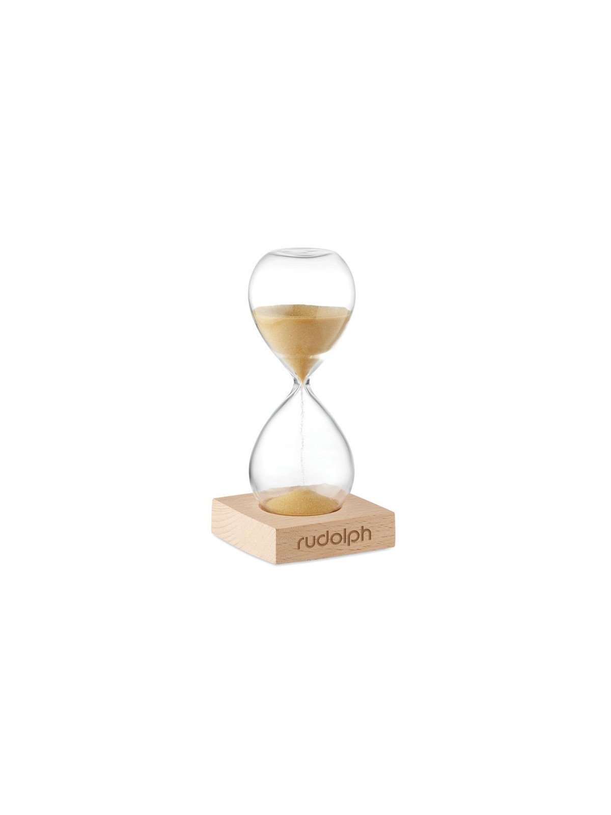 Sablier en verre publicitaire, un objet design et résistant que vous pourrez utiliser comme minuteur de 5 minutes lors de jeux ou comme décoration.