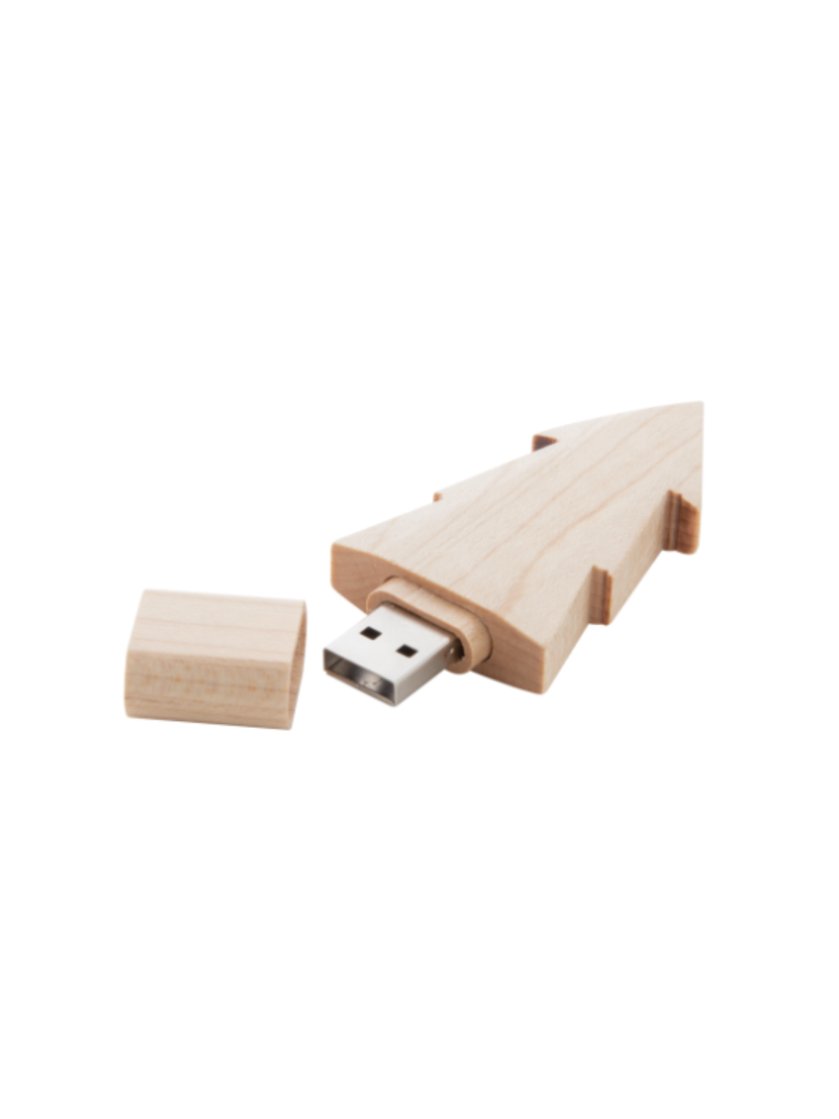 Clé USB publicitaire en forme de sapin, fabriquée en bois.