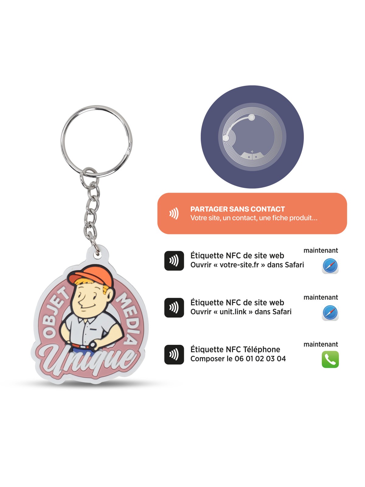 Découvrez notre porte-clés en PVC souple 2D personnalisable avec puce NFC intégrée. Un objet publicitaire innovant et connecté qui associe visibilité de votre marque et technologie sans contact. Entièrement personnalisable en forme, en relief et en couleurs, ce porte-clés devient un véritable support de communication interactif.Grâce à la puce NFC intégrée, vos clients n’ont qu’à approcher leur smartphone pour accéder instantanément à votre site web, une vidéo, une fiche produit, un menu digital, une carte de visite virtuelle ou une offre promotionnelle. Idéal pour les salons professionnels, événements, campagnes marketing, lancements de produits ou programmes de fidélité, ce porte-clés PVC souple 2D avec NFC marque les esprits et facilite l’engagement.En personnalisant ce porte-clés PVC souple connecté avec votre logo ou votre visuel, vous créez un objet publicitaire à forte valeur ajoutée, à la fois pratique, original et technologique. Offrez-le à vos clients, partenaires ou collaborateurs pour renforcer votre image de marque et moderniser votre communication.