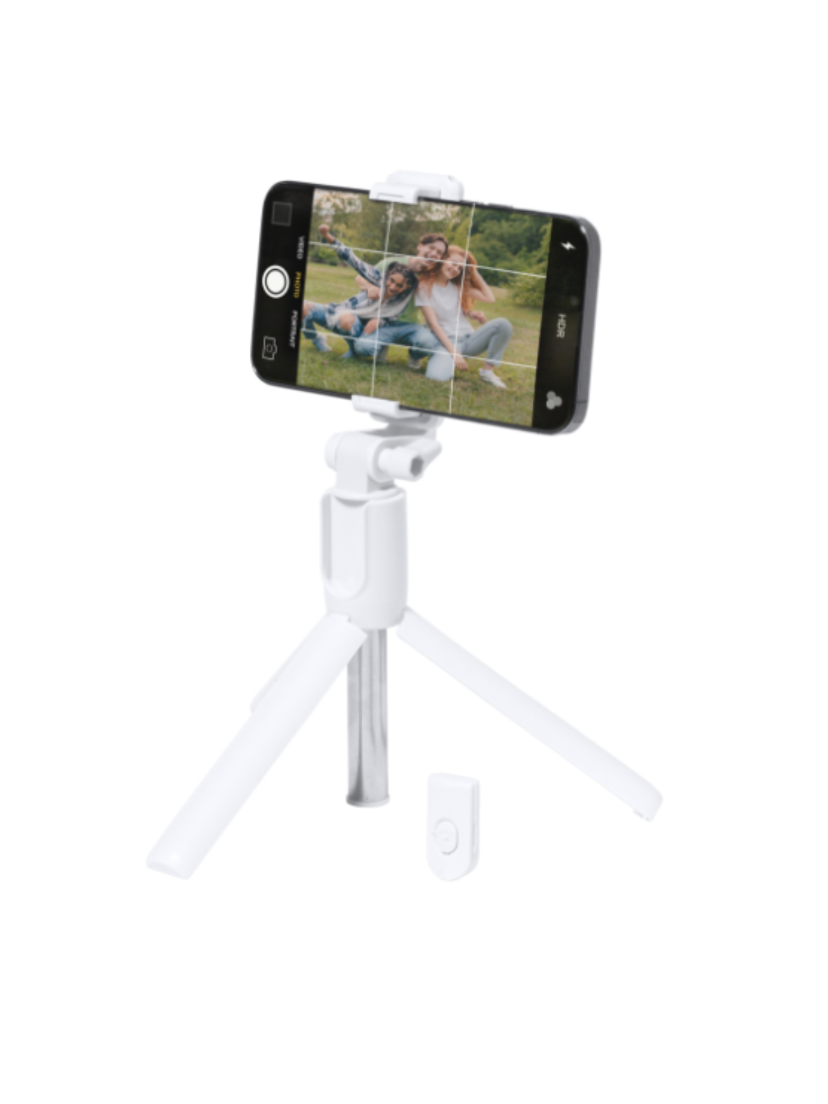 Le trépied et perche à selfie promotionnel est composé d'un support pour téléphone portable réglable et d'une télécommande d'obturation Bluetooth incluse.