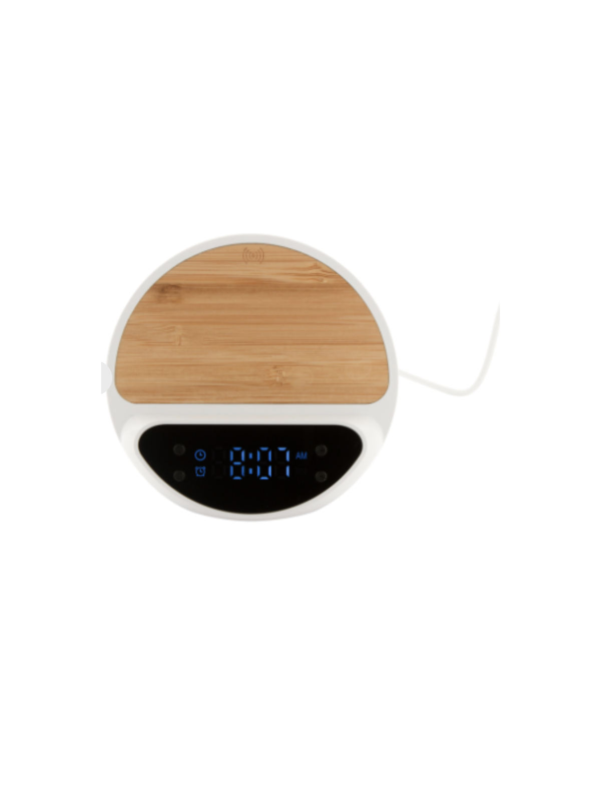 Réveil chargeur publicitaire avec le logo ou le visuel de votre entreprise. Fabriqué dans une démarche éco-responsable, le réveil chargeur publicitaire est entièrement composé d'ABS recyclé et de bambou naturel. Pratique et multifonctions, le réveil chargeur publicitaire comporte ainsi un support mobile avec un chargeur rapide intégré de 15W. Il est également livré avec un câble USB.