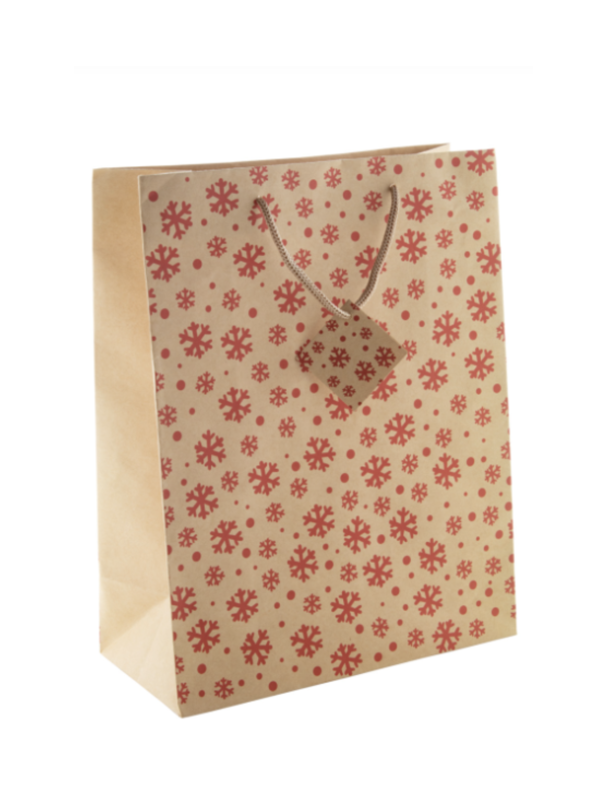 Sac cadeau de Noël publicitaire à personnaliser avec votre logo ou visuel d'entreprise. Respectueux de l'environnement, le sac cadeau de Noël publicitaire est entièrement fabriqué à partir de papier kraft. Le sac est également en grand format et possède une étiquette cadeau accrochée à la anse. Le sac cadeau de Noël publicitaire est de couleur naturelle avec de jolis motifs flocon de neige rouge.